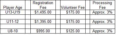 The below chart shows the fee breakdown for each age group. The Volunteer fee is one per family and will show on the registration page as a Service fee which is combined with the Credit/Debit fee for paying using this method.